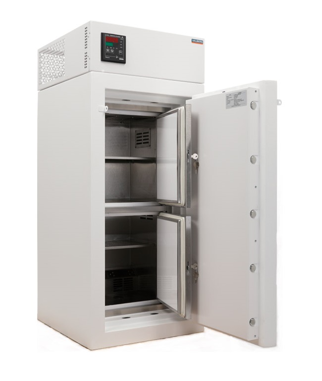 Рабочая камера сейфа холодильника Valberg TS-3/50 EL разделена на две части, выполнена из нержавеющей стали и оснащена отдельной дверцей.