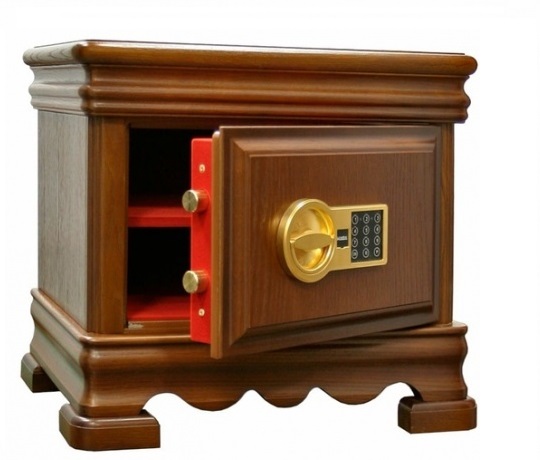 - снаружи сейф отделан натуральным деревом и дубовым шпоном, внутренняя отделка - красный бархат.<